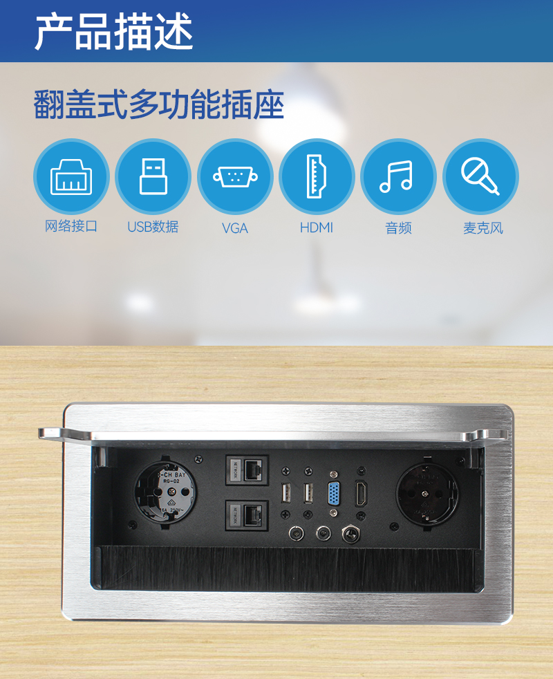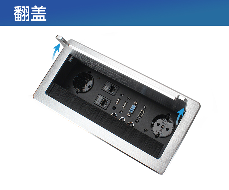 GS301欧标2,网2,USB数据,VGA,HDMI,音2,麦,银色,会议桌翻盖多功能插座带毛刷