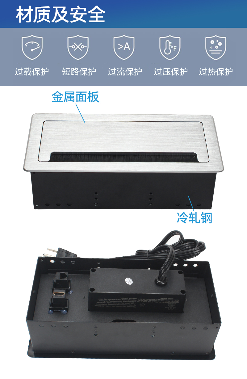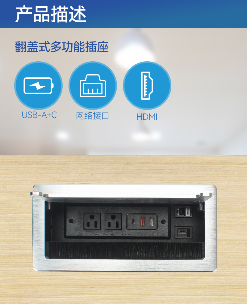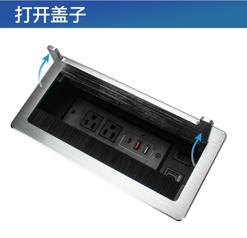 GS301美标2,C口,双A口,网,HDMI,银色,会议桌翻盖多功能插座带毛刷
