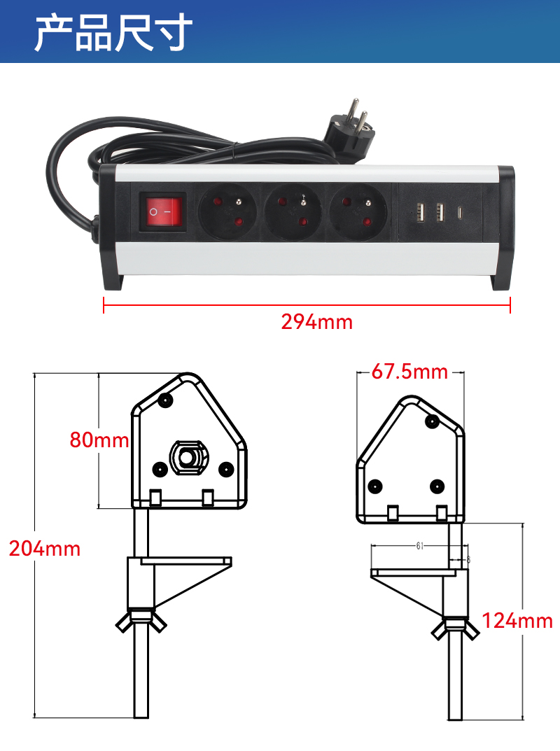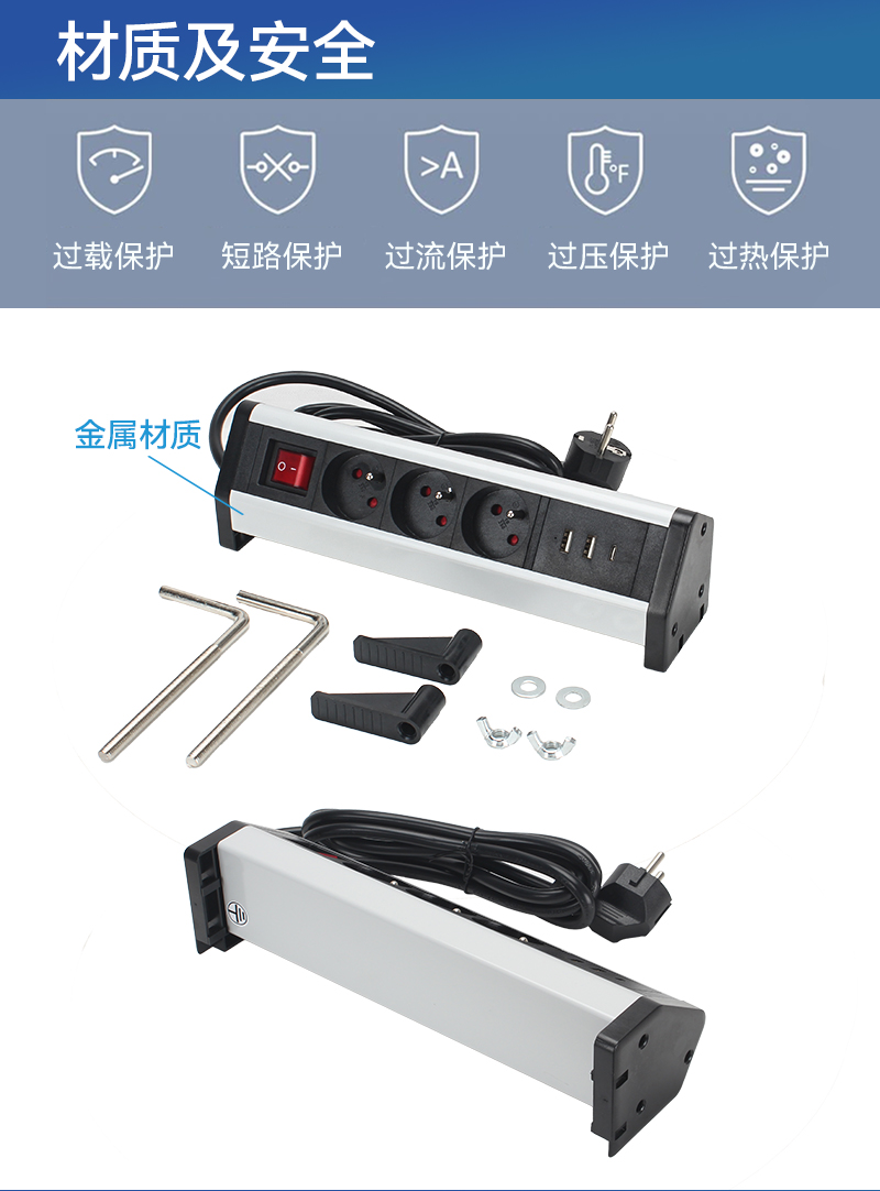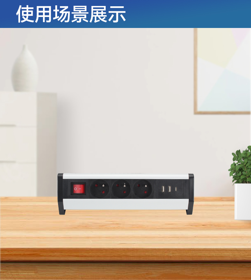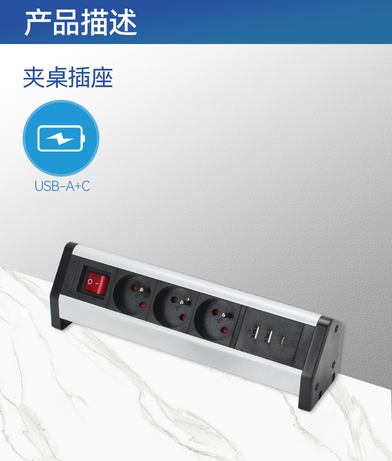 夹桌GS118-L03C法标3,1C2A,开关,银色,桌面夹桌插座